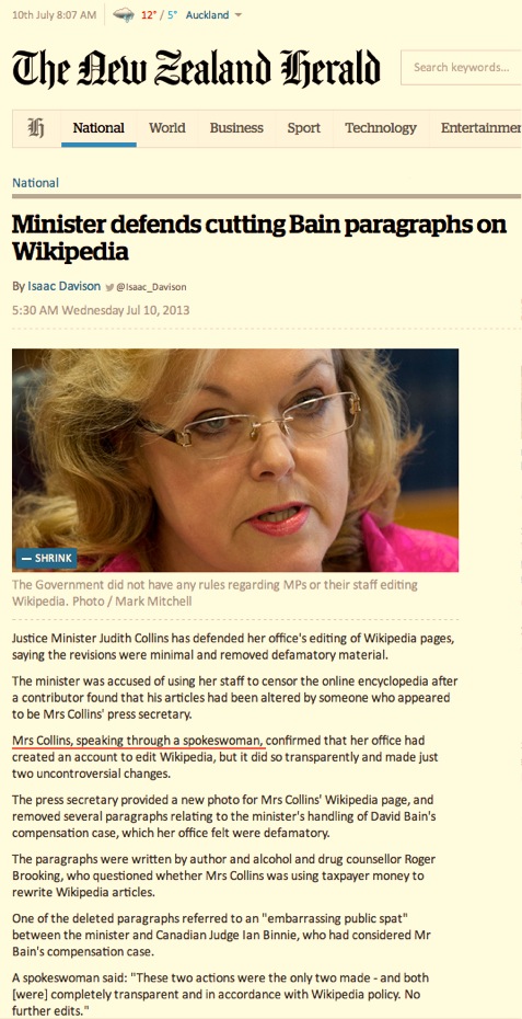 Collins was first accused of editing her own page on Wikipedia in this post: Judith Collins’ staff censoring wikipedia articles on justice issues in NZ? This was after an editor called ‘JC press sec’ (guess who? – now calling herself Polkadot) deleted potentially embarrassing material about her boss. Collins defended her press secretary’s editing of Wikipedia pages, saying the revisions were minimal and claimed she only removed defamatory material. Despite removing material from wikipedia, the same information about the spat between Collins and Judge Binnie was widely reported in other media – see Minister defends cutting Bain paragraphs on Wikipedia.